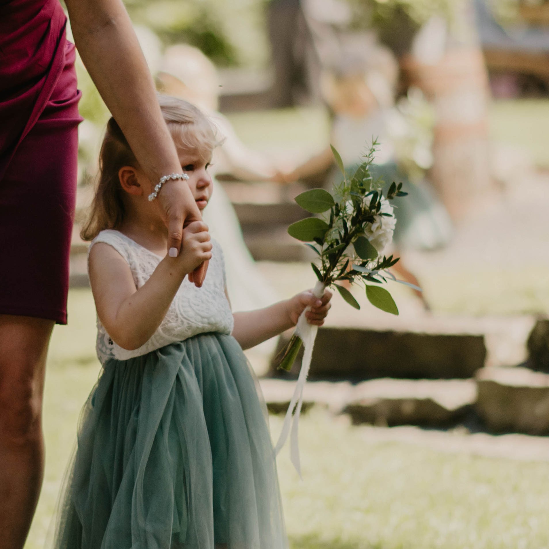 Le bouquet de bouquetière est composé des fleurs du jardin du moment et d'un ruban de soie qui s'agence au bouquet de la mariée.