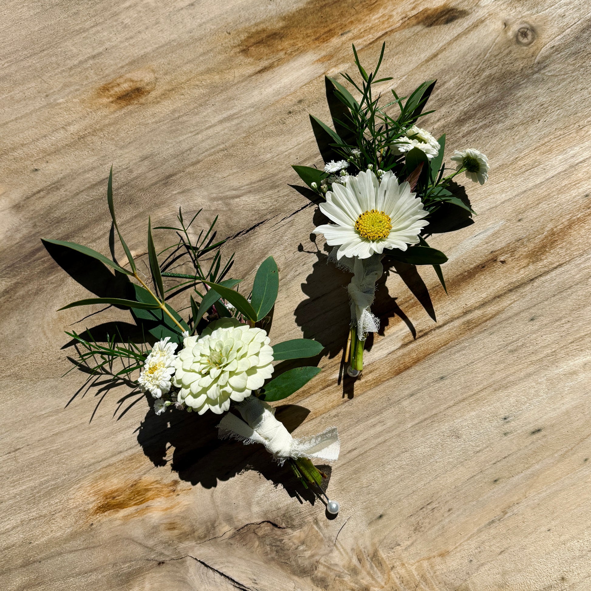 La boutonnière est composé des fleurs du jardin du moment et d'un ruban de soie qui s'agence au bouquet de la mariée.