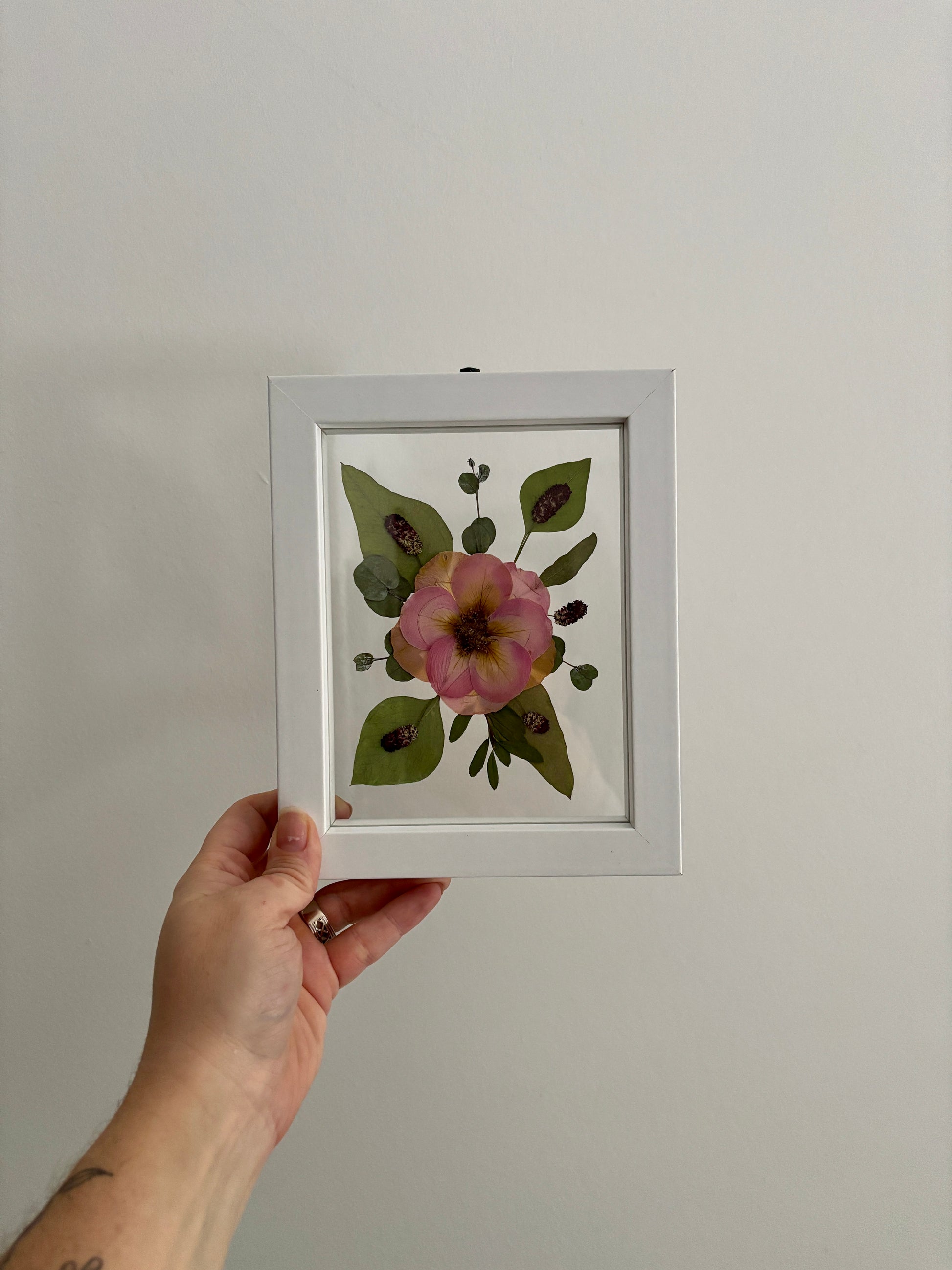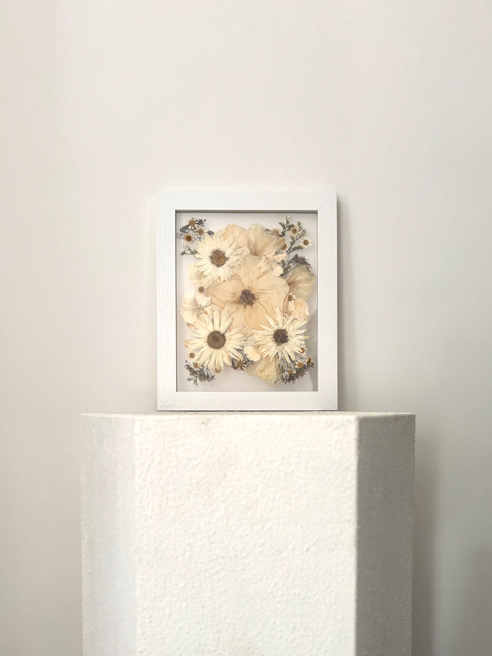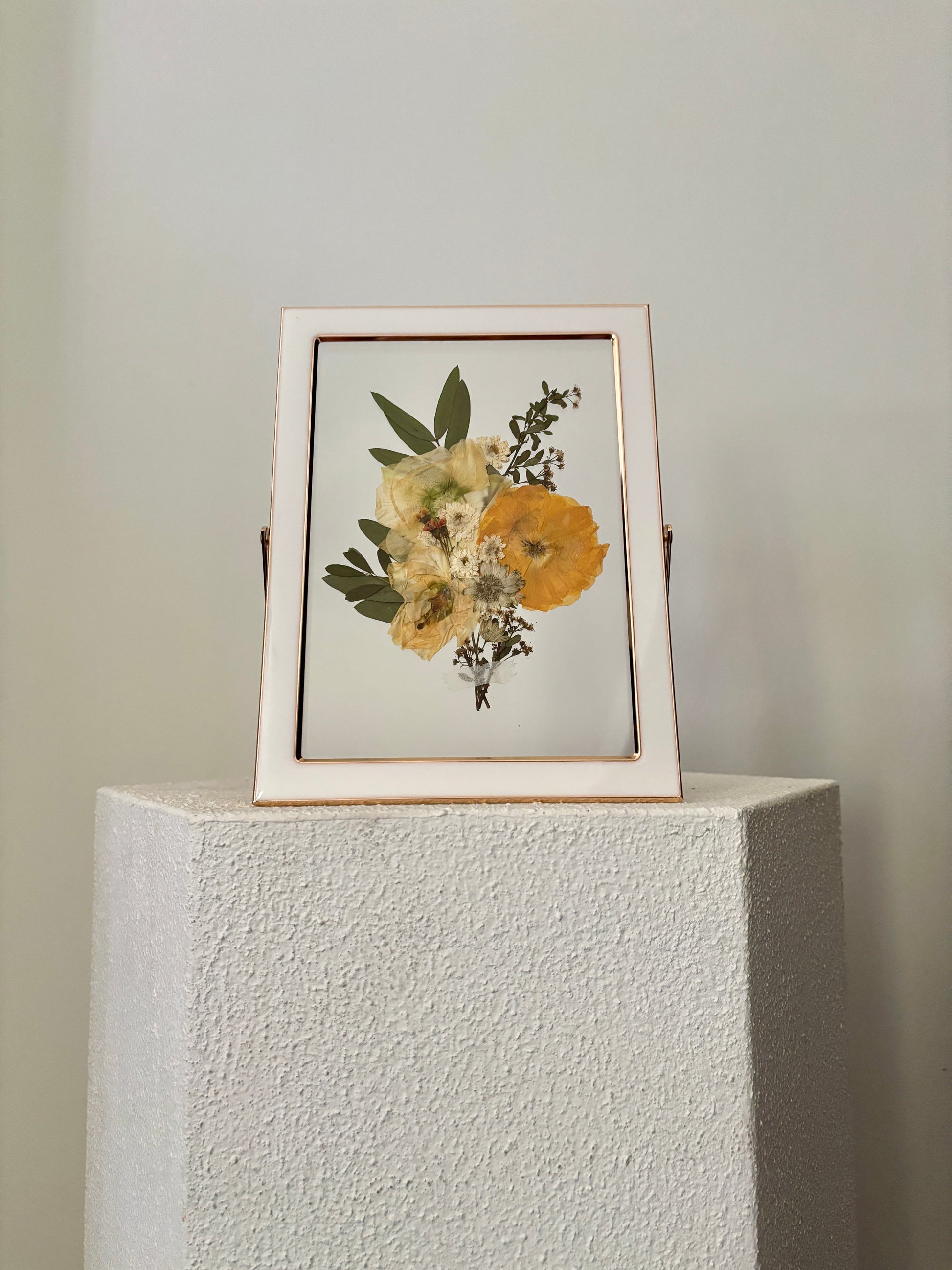 Avec mes cadres floraux pressés, je transforme votre bouquet de mariage ou vos fleurs significatives en une œuvre intemporelle, créée avec douceur et minutie ici, dans les Laurentides.