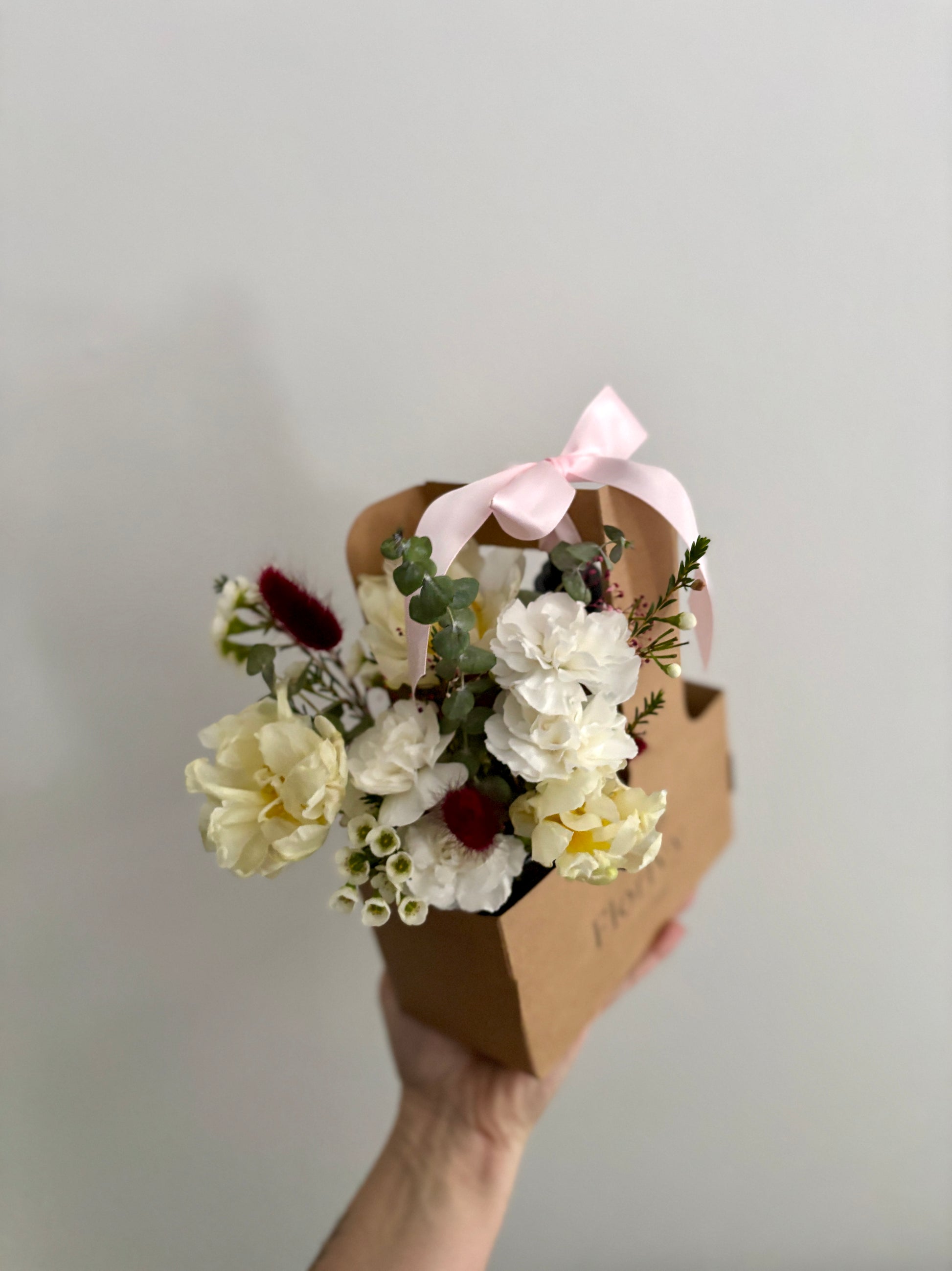 Dans un emballage en carton kraft et un ruban satiné rose.