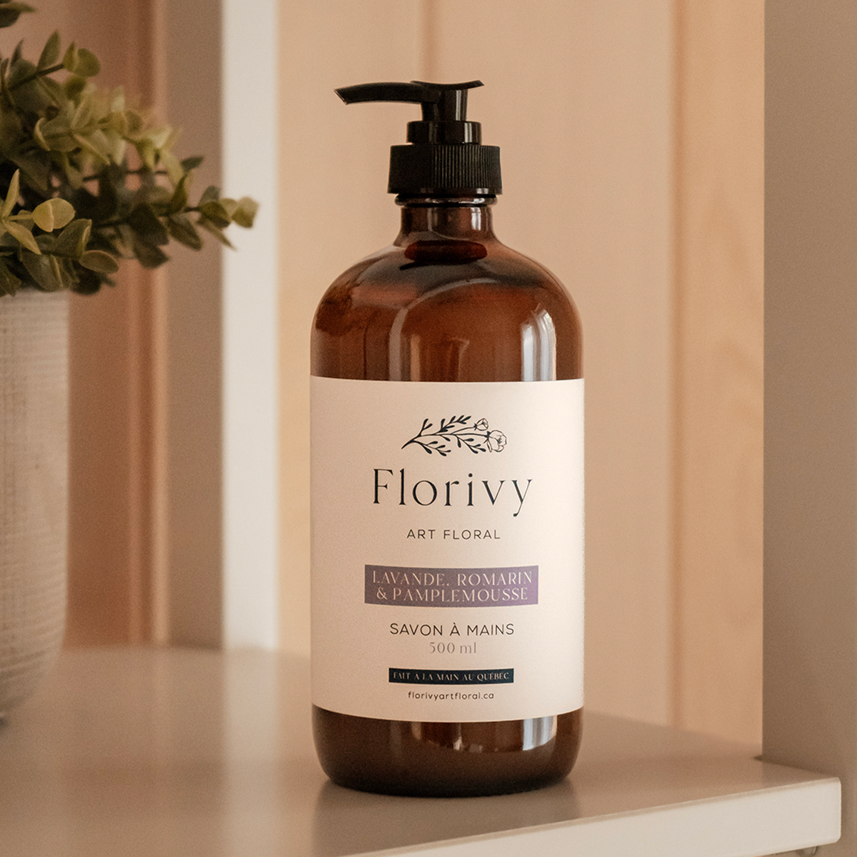 Eau, oléate de potassium, cocoate de potassium, glycérine, huile de ricin, citrate de potassium, acide citrique, gomme de xanthane et huiles essentielles (lavande, romarin, pamplemousse et citron).